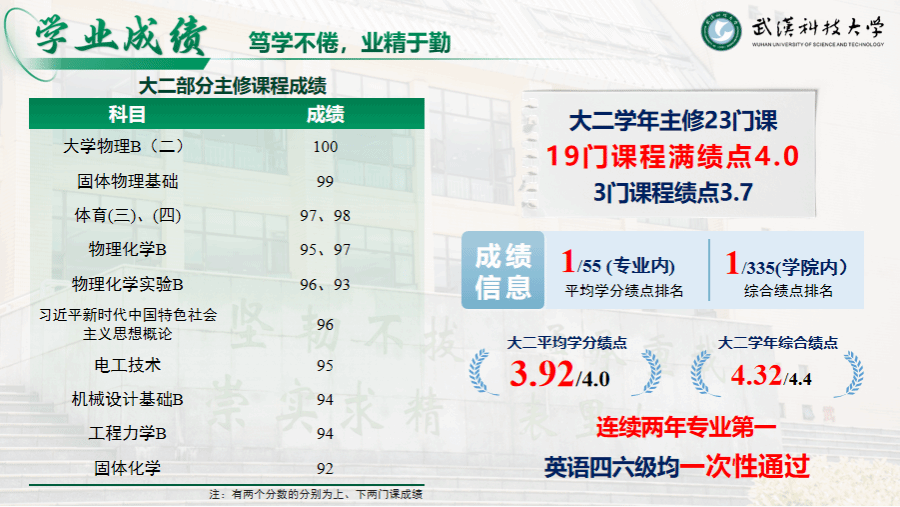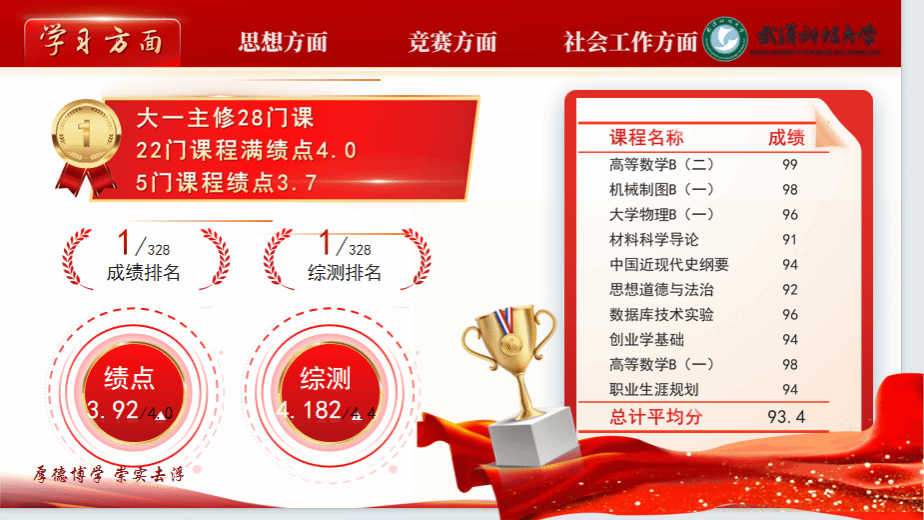 个人简介:甘馨悦,共青团员,无卓2401班。平均学分绩点3.92,专业排名第一,综测绩点4.18,年级排名第一,22门课程满绩点,获得武汉科技大学“特等奖学金”,武汉科技大学学生安全自治委员会“优秀部员”等荣誉。
